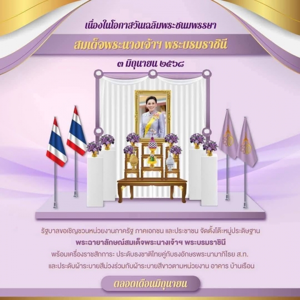 รัฐบาลขอเชิญหน่วยงานภาครัฐ ภาคเอกชน และประชาชน จัดตั้งโต๊ะหมู่ประดิษฐานฉายาลักษณ์สมเด็จพระนางเจ้าฯ พระบรมราชินี พร้อมเครื่องราชสักการะ ประดับธงชาติไทยคู่กับธงพระนามาภิไธย ส.ท. และประดับผ้าระบายสีม่วงร่วมกับผ้าระบายสีขาวตามหน่วยงาน อาคาร บ้านเรือน ตลอดเดือนมิถุนายน 2568