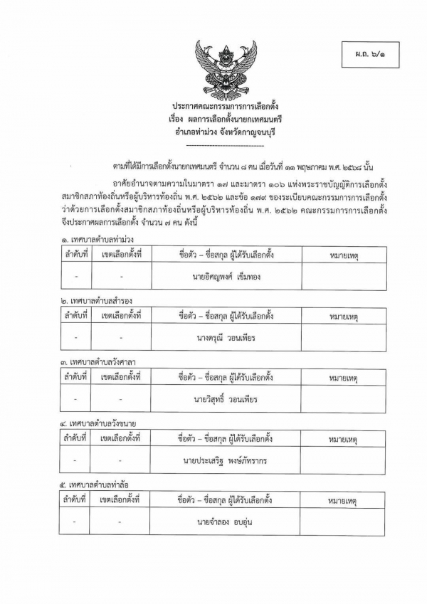 ประกาศคณะกรรมการการเลือกตั้ง เรื่อง ผลการเลือกตั้งนายกเทศมนตรีตำบลวังศาลา และสมาชิกสภาเทศบาลตำบลวังศาลา ตำบลวังศาลาอำเภอท่าม่วง จังหวัดกาญจนบุรี