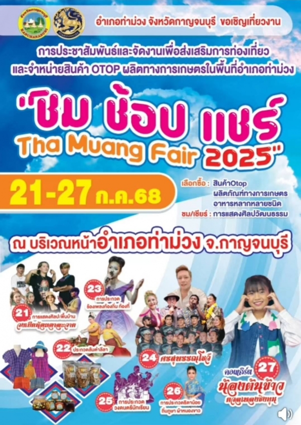 เปิดงาน การประชาสัมพันธ์ และจัดงานเพื่อส่งเสริมการท่องเที่ยว และจำหน่ายสินค้า OTOP ผลิตภัณฑ์ทางการเกษตร อาหารหลากหลายชนิด ชมและเชียร์ศิลปะวัฒนธรรม ในพื้นที่อำเภอท่าม่วง ชิม ช้อป แชร์ Tha Muang Fair 2025