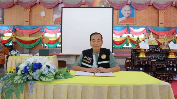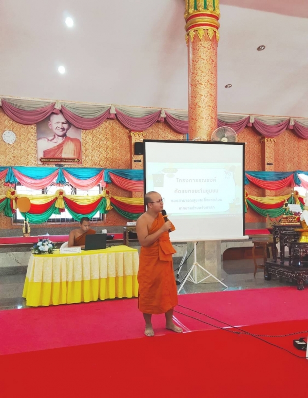 พระสมุห์อลงกรณ์ ภูริวฑฒโก เลขานุการรองเจ้าคณะอำเภอท่าม่วง วัดหนองเสือ ตำบลวังศาลา บรรยายธรรม ในการปลูกจิตสำนึก และสร้างวินัยด้านการคัดแยกขยะที่ต้นทางของครัวเรือน