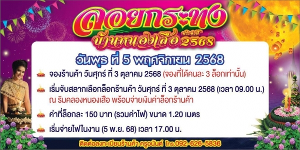 ข่าวฝากประชาสัมพันธ์จาก โรงเรียนวัดหนองเสือ เรื่อง การเปิดจองร้านค้า เนื่องในงานวันลอยกระทง ณ คลองหนองเสือ ประจำปี 2568